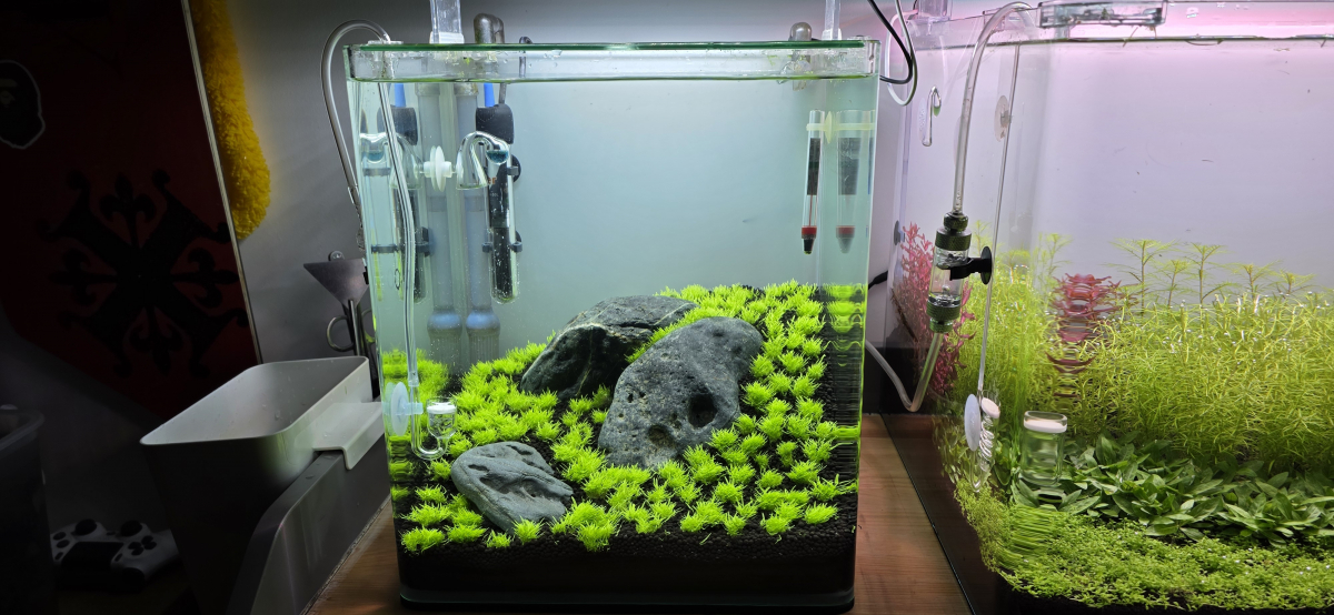 Pareil moi j'ai utilisé cette plante dans mon niwagumi mais fais bien attention c'est une plante très compliqué ça déteste les nitrites et surtout si tu as des poissons qui vont fouiller le fond ils vont te la défoncer si tu les nourris tes poissons avec des paillettes qui coulent au fond de l'aquarium pareil les poissons vont défoncer hemianthus