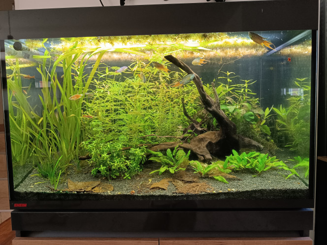Apres bien des viscidules avec mes bac ces12 derniers mois dont dont une cyano dont je n'arrivais pas à me débarrasser et un départ à zero de mes bacs me revoilà avec ce premier bac qui a désormais 6 semaines et qui accueille des macropodes opercularis qui rejoindront leur bassin la semaine prochaine, on y trouve aussi 3 Bettas Smaragdina ainsi que 5 barbus cerise.