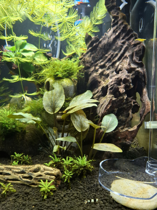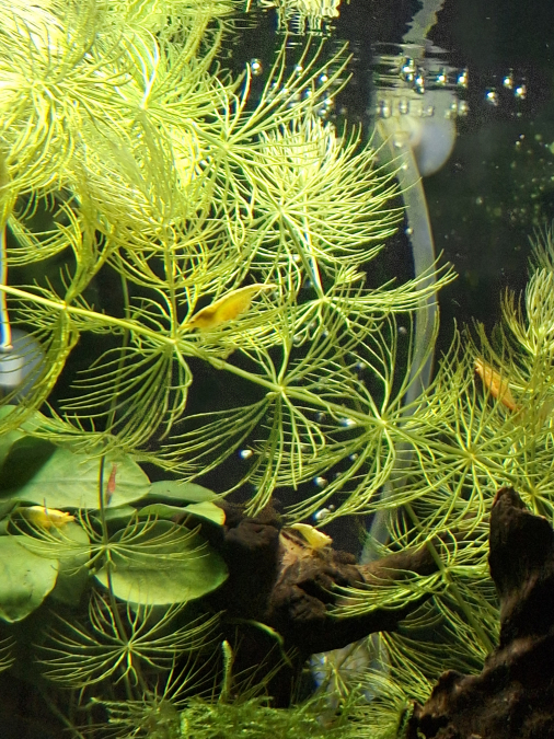 5 neocaridinas grainées et les caridinas blackcrystal nées dans le précédent bac ont également déménagé. Elles semblent toutes se plaire dans ce nouveau bac plus grand :-).