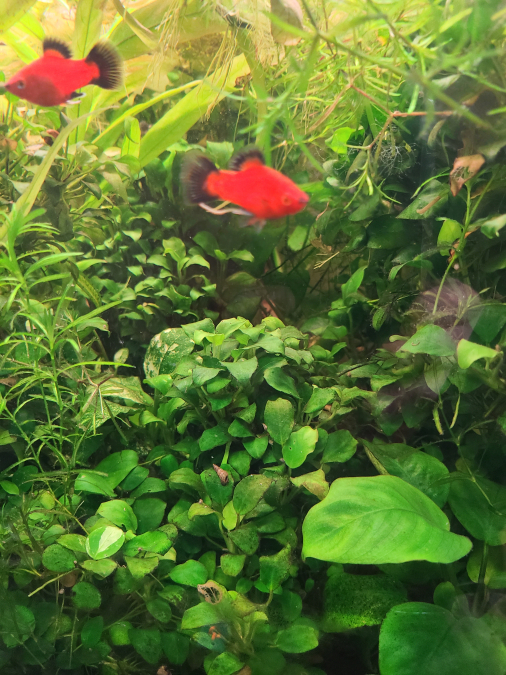 le contraste entre le vert des Anubias et le rouge des platys corail