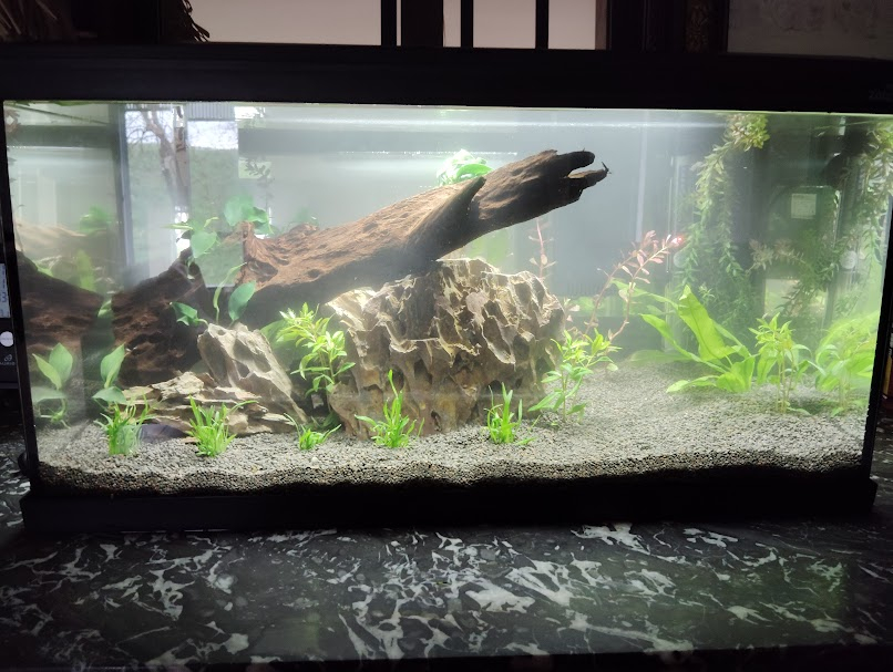 Salut, petite population peut-être mais les recommandations de maintient des ces espèces ne sont pas respectées dans ton bac. Si tu prévois 8 galaxy de plus, 3 ou 6 amandae, 6 Cory ça va faire beaucoup beaucoup de monde de ce volume. 60L brut, avec une grosse racine et pas mal de roches, à mon avis tu es à 40L net ça fait trop peu. Sans compter que le sol n’est pas adapté pour les Cory, et que les conditions de maintient (pH, température etc) ne sont pas les mêmes pour tes pensionnaires. C’est très mignon comme bac mais 10 ou 15 galaxy seuls seraient mieux installés que ce petit mélange. Je ne dis pas cela pour t’embêter mais c’est juste pour que tu puisses avoir un regard critique sur la suite de ce bac