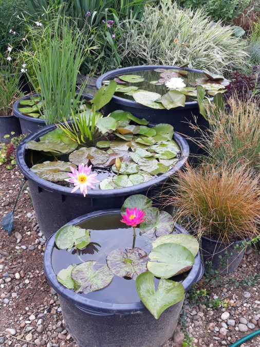 Un bassin préformé de 500 l permettra déjà de mettre des poissons qui y resteront l hiver et comme c est à même le sol , les grenouilles ou crapauds ,vont s inviter ce qui ne peut être le cas avec un contenant haut ..