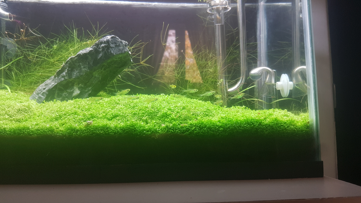 Bonjour, je suis de retour. J'ai eu pas mal de souci avec cet aquarium et j'ai perdu la plupart de mes poissons à cause d'un accident de co2. J'ai réussi à sauver deux poissons en les mettant d'urgence dans un autre bac. J'ai arrêté de mettre du co2 pour l'instant, histoire de ne rien risquer. Et vu la gueule de mes plantes, je ne m'inquiètes pas trop pour elles. Ça fait des mois que j'attendais dêtre sûr qu'il n'y ait pas de problème avec l'aquarium. Surtout avec la mort de ma mygale le mois dernier, j'avais peur de ne pas pouvoir bien m'occuper d'autres poissons. Les microdevario kubotais sont des animaux sociaux, donc bien sûr, je prévoyais d'en reprendre. Même si ceux qu'il me restait se battaient tous le temps. Il y en avais un des deux qui étais chétif, peut-être même un peu mal formé. Je ne sais même pas pourquoi il a survécu en premier lieu mais il est mort il y a quelques semaines. Donc un seul kubotai allais souffrir s'il était aussi seul, j'en ai donc repris. Ils sont 11. Ils viennent d'une exposition donc très stressés quand je les ai eu. Mais je prnse que j'ai pris la bonne décision parce que celui qu il me restait est toujours avec eux. Ils ont repris de la coulrur et semblent aller assez bien. Ils viennent pour manger et tout. Donc maintenant, ce qui est bizarre, mon ancien banc était beaucoup plus dispersé et au lieu de se tenir au milieu, ils restent au fond du bac et bien qu'ils nagent, ils font quasiment que du sur place. Et mon poisson que j'si drpuis le plus longtemps et qui ne faisait pas ça avant immite leur comportement. Est- ce que quelqu'un aurait une idée si c'est normal?
