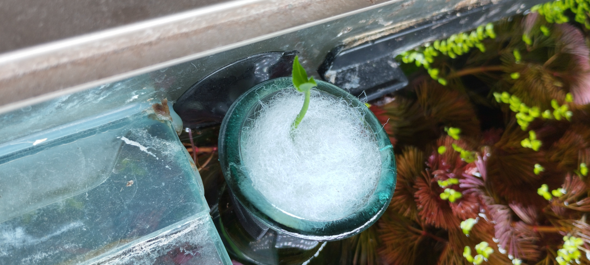 Voici une jeune pousse de citronnier que j'ai disposé dans une petite fiole en partie immergée à l'arrière plan de mon aquarium hollandais. Ils ont mis le temps, mais j'ai réussi à faire germer 3 pépins de citron bio dans du coton. Cette pousse possède déjà 2 petites feuilles. J'espère qu'elle profitera bien de l'éclairage WRGB pour se développer... 😋🌱