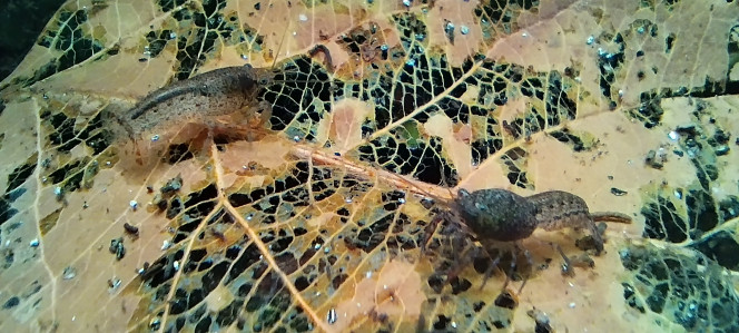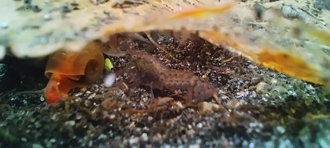 Merci, j'ai réussi à la prendre en photo alors qu'elle partait se cacher sous la feuille. On peut bien distinguer le pouvoir de mimétisme sur le sol sombre. Et il ne s'agit que d'une juvénile. On distingue un Planorbe rouge à côté, et derrière se tient un Asolène spixii...