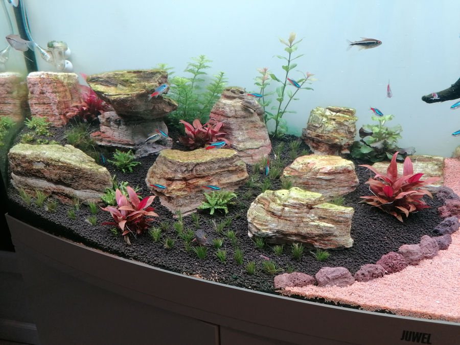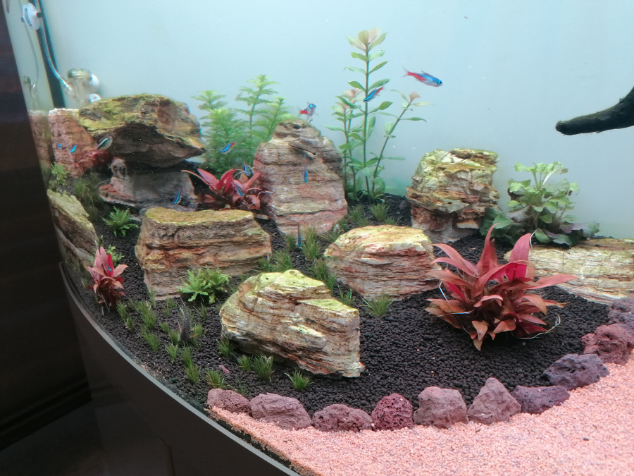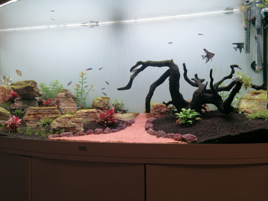 J'ai mis crevette amano. 3 octocinclus. Un banc de 17 néon. 1 Gourami perlé et 1 doré. Pour finir avec 3 scalaire noir.