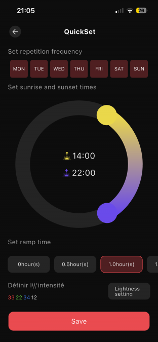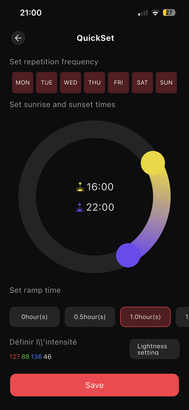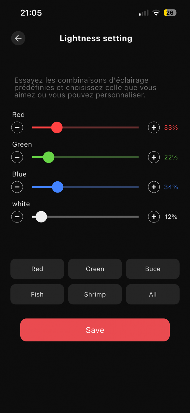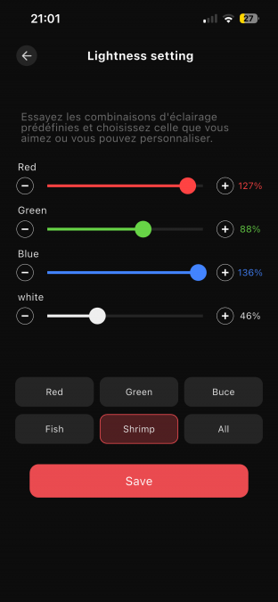 je souhaiterai bénéficier de conseils sur la rampe CHIHIROS WRGB 2 PRO en 120cm. J'ai un aquarium planté de 320l que je viens de relancer intégralement. Je n'ai pas de Co2. La configuration actuelle de la rampe est de 6h d'éclairage avec la simulation de lever/coucher de soleil d'1h, soit 4h d'éclairage à fond. L'intensité lumineuse suit le mode "shrimp" avec la répartition suivante (Red 127%, green 88%, Blue 136%, White 46%). Mon inquiétude est que la rampe présente un nombre de 12920 lumens suivant fabricant qui me semble trop élevé pour mon bac. (40lm/l). Aussi, je voudrais avoir votre avis sur le réglage de l'intensité lumineuse et donc des % RGBW indiqués plus haut.