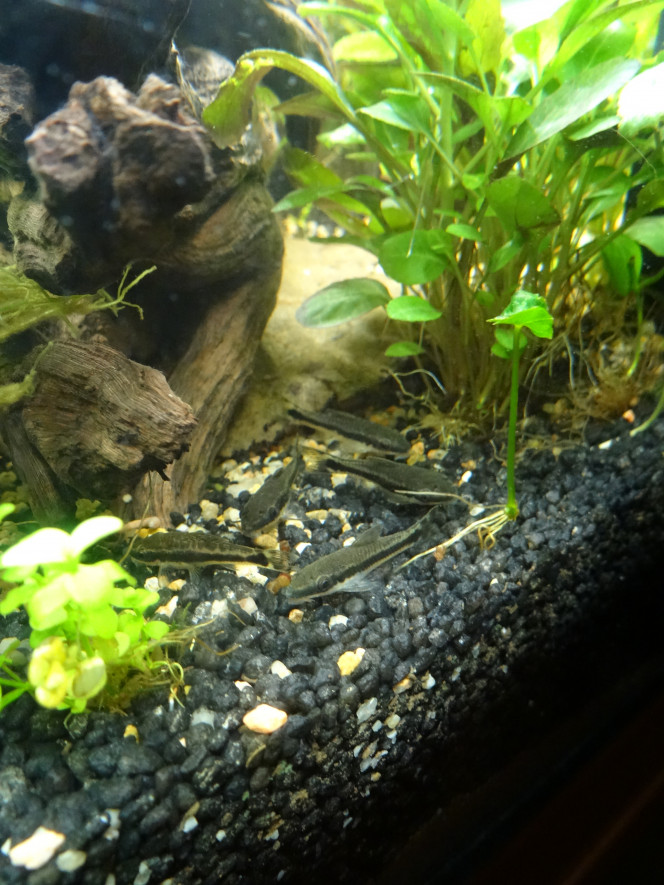 J'en ai un aussi qui joue les timides avec le groupe, plus solitaire, souvent indépendant dans le bac. Il est aussi plus petit et de teinte et motif légèrement différent (plus doré, comme moucheté). Sans doute une autre variété retrouvée là par hasard... Il rejoint cependant parfois la formation. Quand j'en compte 5, je cherche le "vilain petit oto" :p