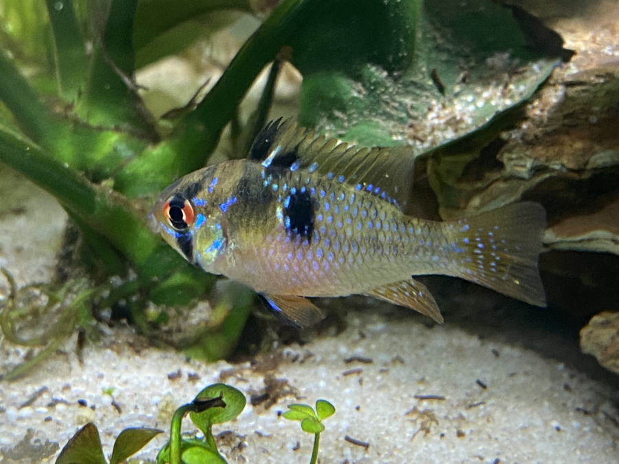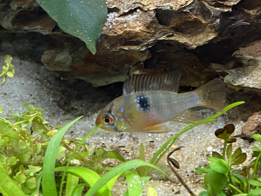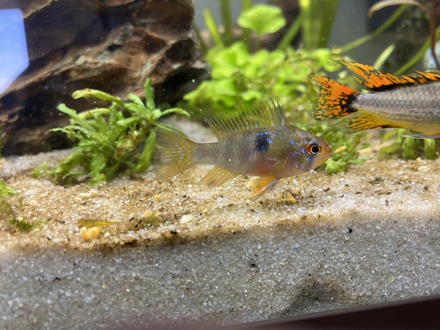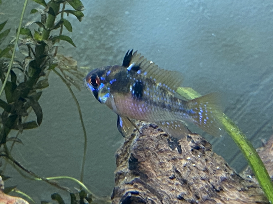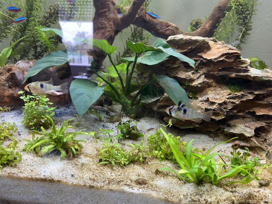 Lors de l’acclimatation, tout se passait bien. En revanche, en rentrant du travail le soir, j’ai remarqué que ce que je pensais être la femelle semblait chasser le « mâle » ramirezi, ainsi que le mâle et la femelle cacatuoides (par moments), et parfois aussi mes ancistrus.