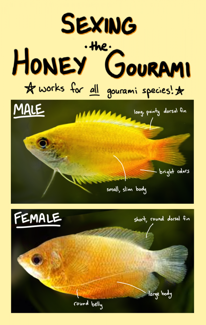 J'ai un aquarium de 60l avec deux gourami miel. Pour le sexage, je n'ai pas de doutes sur le premier, c'est bien un mâle, par contre pour le deuxième, j'ai plus de mal, car il change souvent de couleur et ses nageoires ne me disent rien. ça fait 2 mois que je les ai.