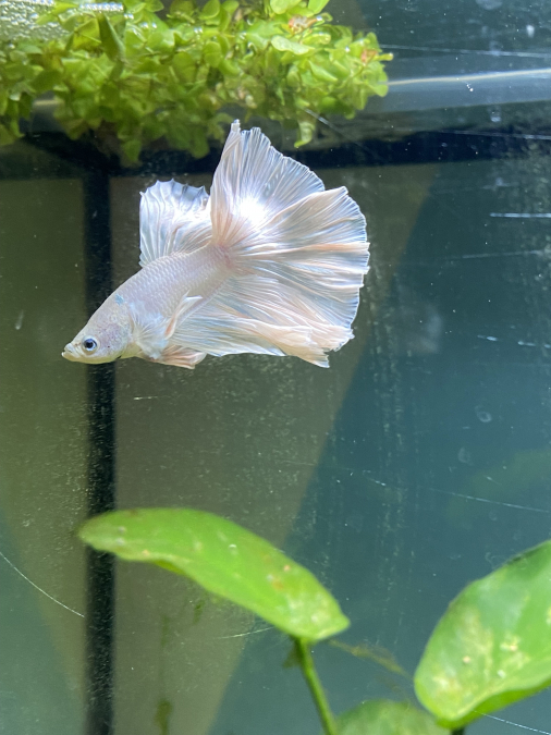 Ton betta présente des reflets bleutés un peu partout sur les voiles. Les bettas, comme les poissons rouges, sont susceptibles de changer de couleur tout au long de leur vie. Les bettas blancs virent souvent au rose pâle ; le tien prend une autre orientation.