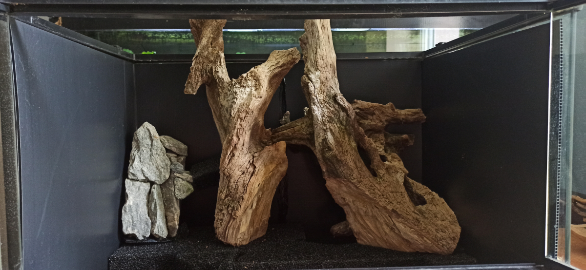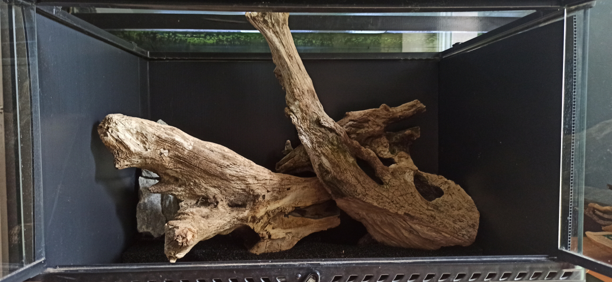 Il y aura aussi des racines de lierre sur les parois latérales + des pots de fleurs. Par contre dans la dernière photo, je pense inverser l'emplacement de la cascade et faire passer l'écoulement de l'eau par-dessus la base de la racine 1. Rien n'est collé pour l'instant.