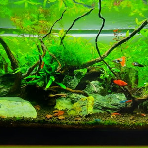 Aquarium communautaire avec population variée mais peu dense et non agressive (Rasbora Galaxy, crevettes, escargots, et crabe Limnopilos.